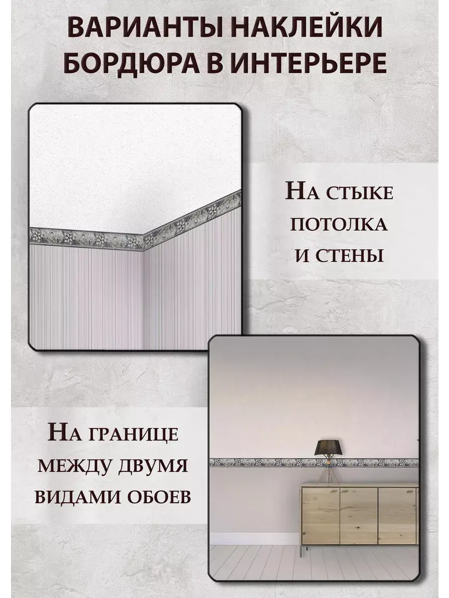 Бордюр бумажный для обоев (бордюрная лента на стену) – недорогой отделочный материал, с помощью которого можно очень быстро дополнить интерьер. Бордюры для обоев узкий или широкий (окантовка) имеют различные варианты по размерам (ширина 4,6,9,12 см.) и местам расположения. Комплект состоит из 20 полос, длина полосы 70 см., общая длина комплекта 14 м.