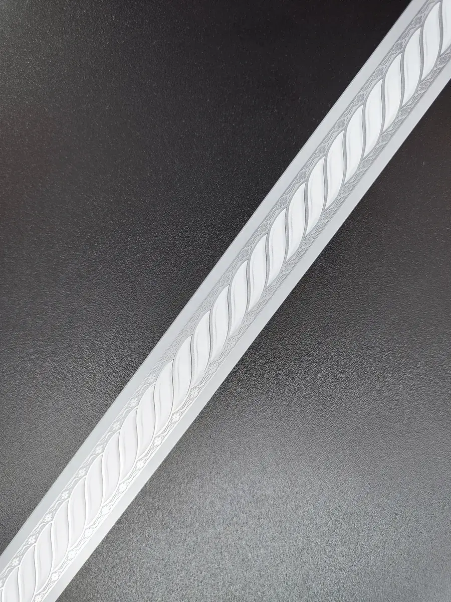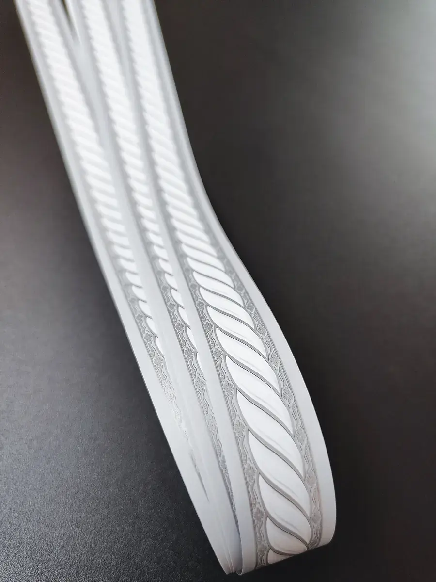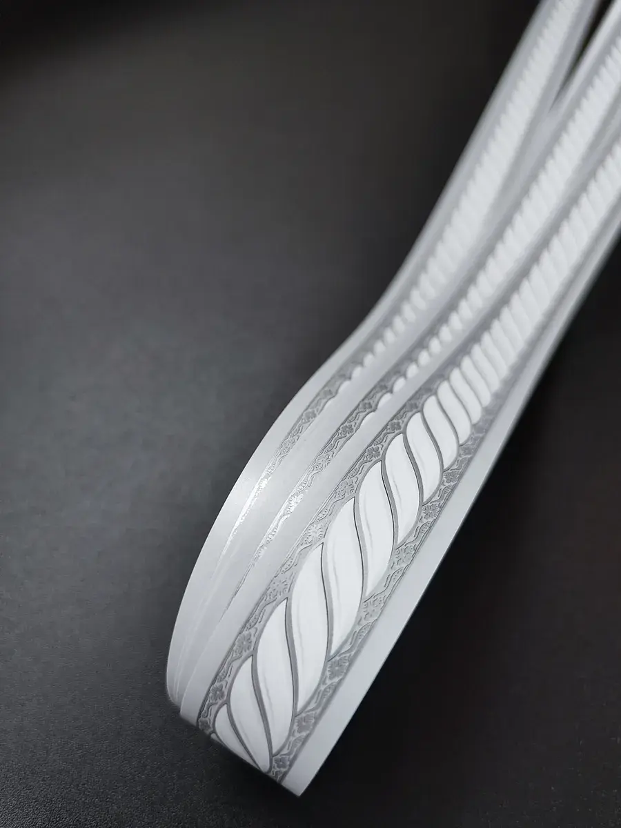Изготовленный из бумажного материала, бордюр обладает достаточной гибкостью, чтобы легко адаптироваться к различным поверхностям, в том числе и к галтелям и потолочным стыкам. Его можно использовать как для плинтусов, так и для создания контуров и окантовки на настенных поверхностях.