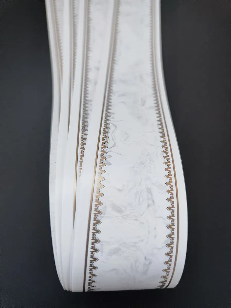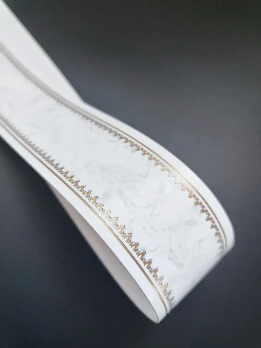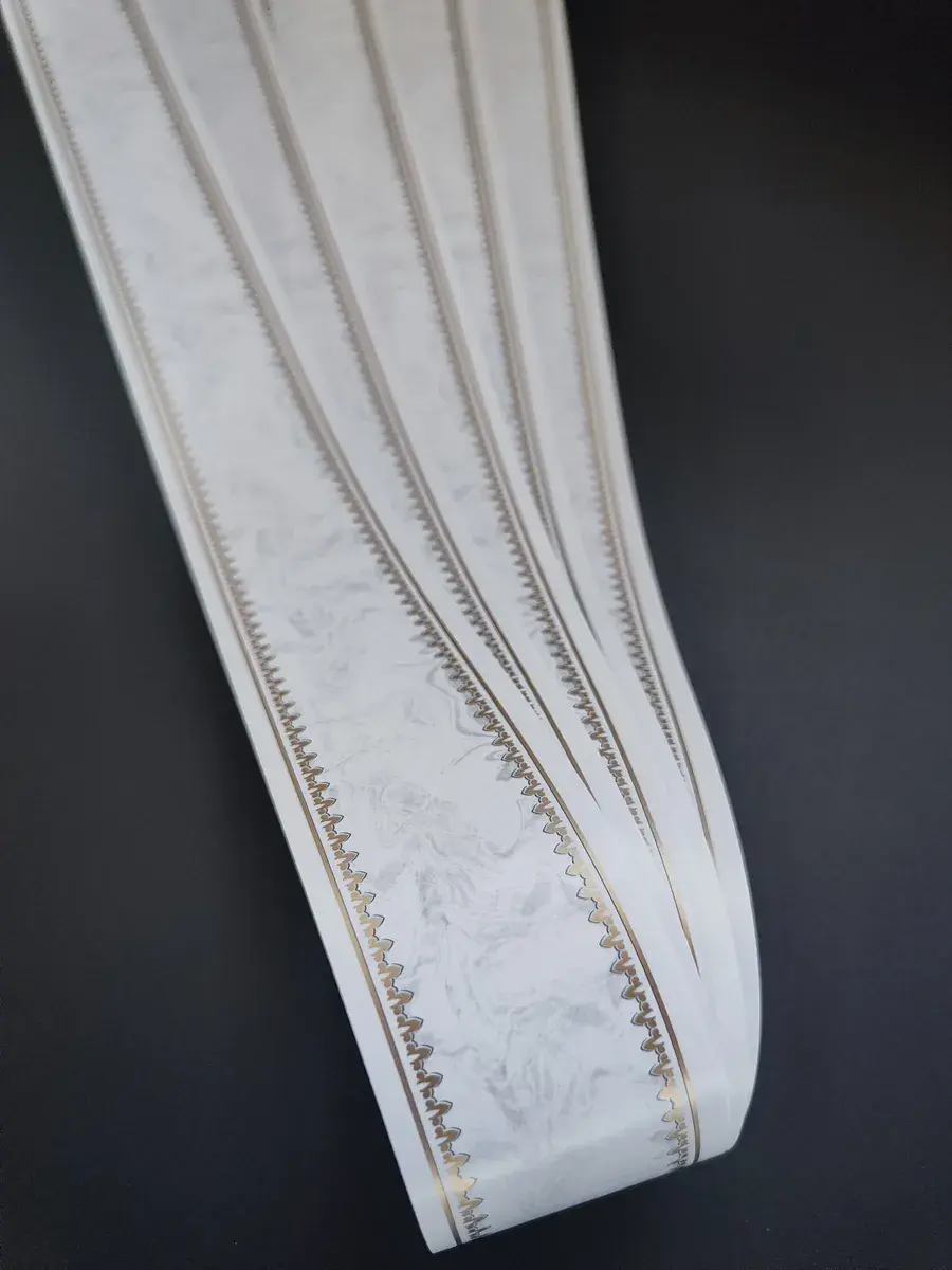 Изготовленный из бумажного материала, бордюр обладает достаточной гибкостью, чтобы легко адаптироваться к различным поверхностям, в том числе и к галтелям и потолочным стыкам. Его можно использовать как для плинтусов, так и для создания контуров и окантовки на настенных поверхностях.