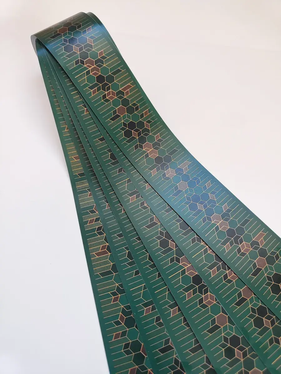 Изготовленный из бумажного материала, бордюр обладает достаточной гибкостью, чтобы легко адаптироваться к различным поверхностям, в том числе и к галтелям и потолочным стыкам. Его можно использовать как для плинтусов, так и для создания контуров и окантовки на настенных поверхностях.