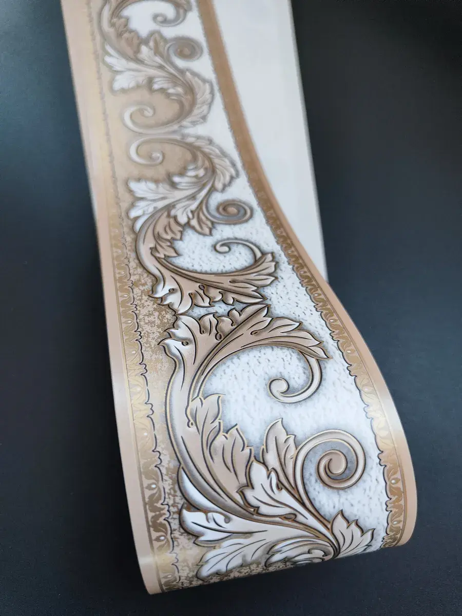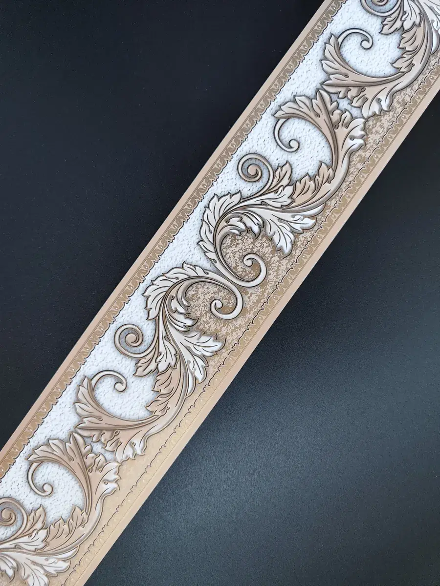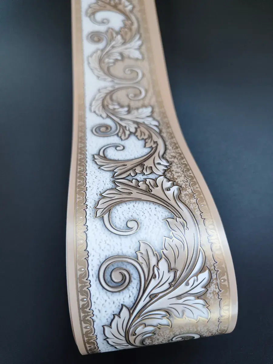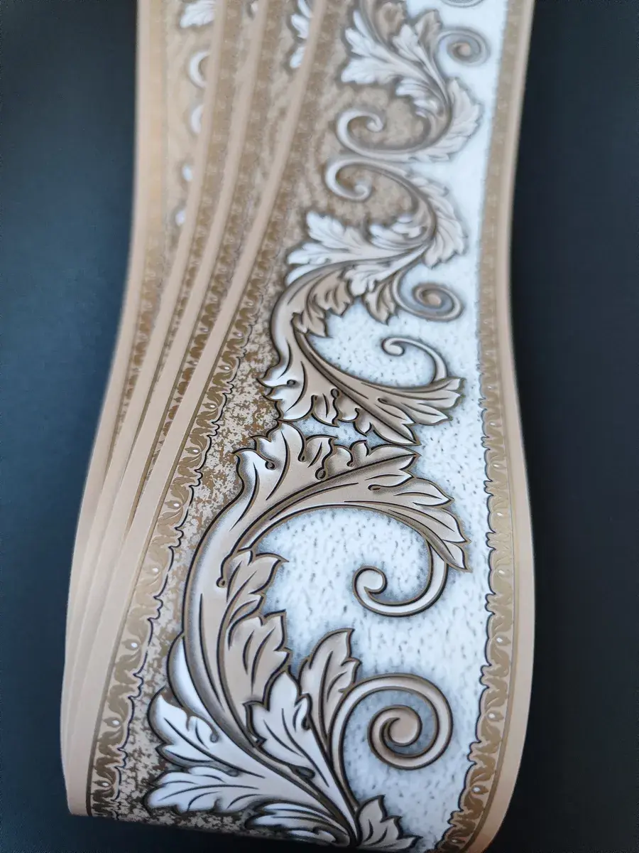 Изготовленный из бумажного материала, бордюр обладает достаточной гибкостью, чтобы легко адаптироваться к различным поверхностям, в том числе и к галтелям и потолочным стыкам. Его можно использовать как для плинтусов, так и для создания контуров и окантовки на настенных поверхностях.